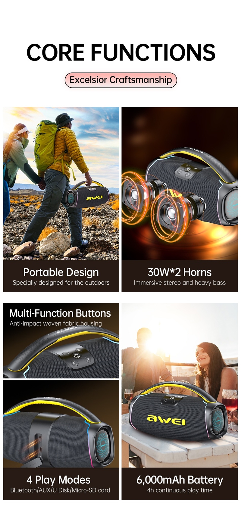 اگر بهدنبال یک اسپیکر بلوتوث قابلحمل با قدرت صدای فوقالعاده و امکانات متنوع هستید، اسپیکر بلوتوث اوی Awei KA16 انتخابی هوشمندانه برای شماست. این اسپیکر با توان خروجی 60 وات و طراحی مقاوم، نهتنها برای استفاده در فضای داخلی مناسب است، بلکه در مهمانیهای فضای باز، سفرها و پیکنیکها نیز عملکردی عالی از خود نشان میدهد. اسپیکر بلوتوثی Awei KA16 ترکیبی از قدرت، کیفیت صدا، دوام باتری و ظاهر جذاب را در یک محصول جمعوجور و خوشساخت ارائه میدهد.