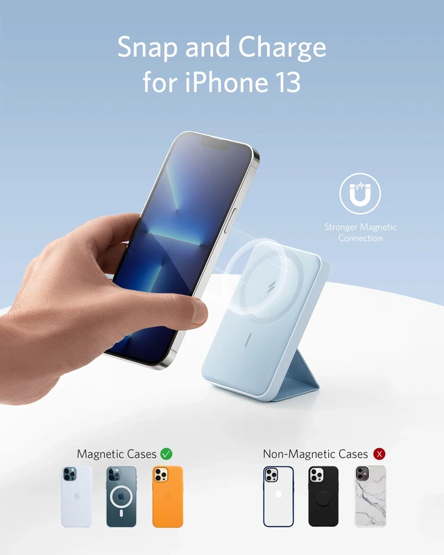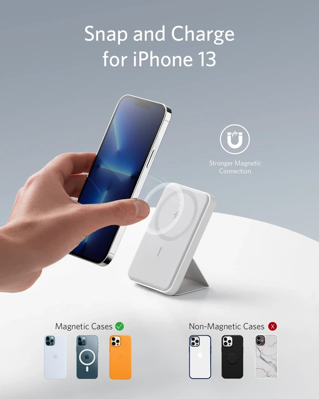 شارژر قابل حمل مغناطیسی آیفون سری 12 تا 14 شما را در حین شارژ نگه می دارد و آن را با پایه ای ترکیب می کند که می تواند باز شود و به عنوان پایه تلفن عمل کند.